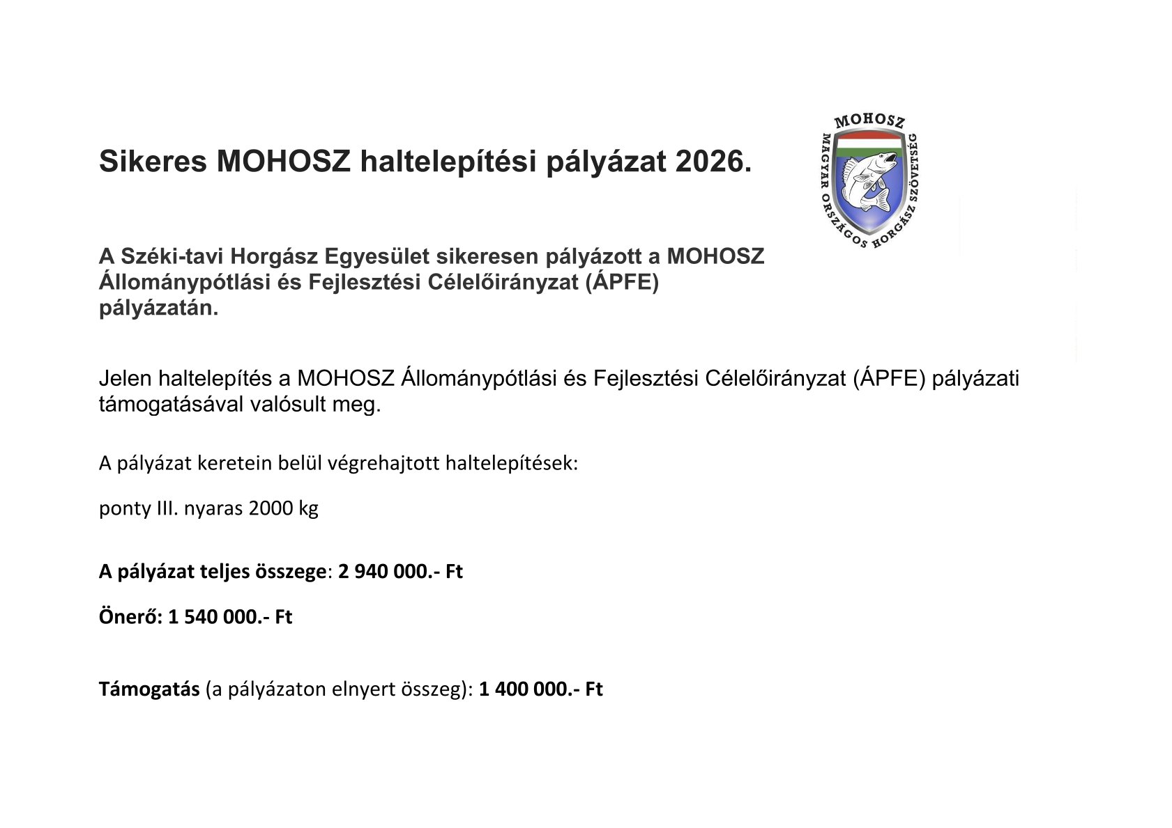 Az Európai Unió és a Magyar Kormány támogatásával a TOP 1.2.5-15-VE1-2016-00014 azonosítószámú "Családbarát horgászturisztikai desztináció és horgász tanösvény kialakítása a Széki Tónál" társfinanszírozott pályázatból 93,32 millió Ft vissza nem térítendő támogatást kapott a Széki Tó Horgászegyesület.
